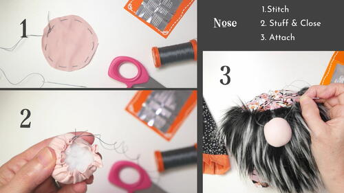 To make the nose: Hand stitch long running stitches all the way around the nose fabric with a needle and strong thread. Put some fiberfill in the center and pull the threads to close up the circle with the fiber inside. Knot the thread so the nose stays closed, then use the remainder of the thread to sew the nose onto the gnome beard, near the top center of the body.