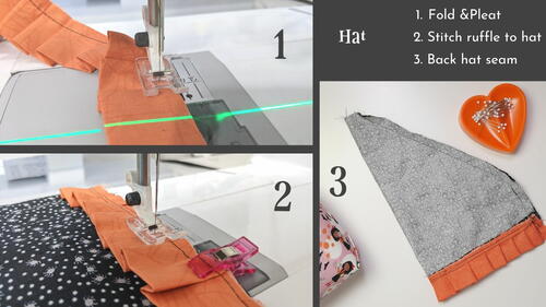 Stitch the pleated ruffle to the base of the hat with right sides together using a ½” seam allowance.