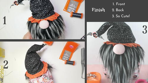 Place the hat on the head so the front ruffle is just sitting on top of the nose. Pull down the hat in the back, and scrunch the hat so it looks like it’s too big and has fallen over the gnome’s eyes. You can add fiberfill to the hat if you’d like. Hand stitch or glue the hat in place.