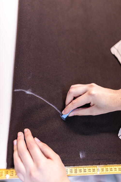 To trace the neckline, starting at the same corner from which you started on the folded side of the fabric, mark 6 inches (15 cm) at several points and join them together, making a curve drawn with chalk.