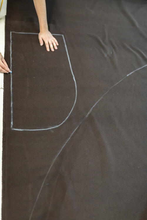 To draw the pattern for the hood, turn to the project patterns. Trace it onto paper and cut it out. Then place the pattern in the triangle of fabric that is left over after drawing the curve in step 3. Cut out the two hood pieces.