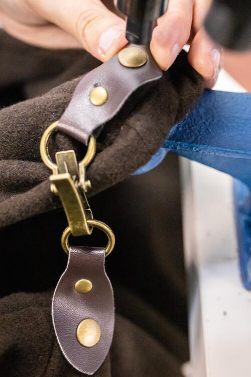 Attach your chosen closure to the upper part of the cape. For our project we chose a pair of metal clasps with leather or leatherette pieces that are attached by rivets to the cape. To attach this type of closure, first make holes both in the leather and in the cape, then join them with flat metal rivets.