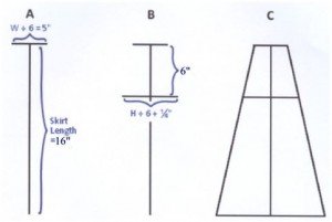- Begin by making a “T” — the top of the “T” is equal to the child’s waist measurement divided by 6. This sample has a waist of 30″, so divide 30″ by 6 to equal 5″. The vertical line (drawn from the center of the top line) is the skirt length, and our sample is 16″.