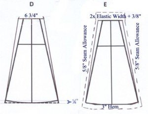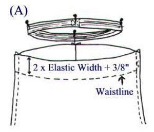 - In the previous Step E, you were instructed how to make the waist allowance on the fabric to be twice the width of the elastic etc, so now we’re ready for the elastic. Mark the waistline with a basting thread, as indicated in the above drawing. Cut a length of elastic to fit around the waist plus 1/2″.