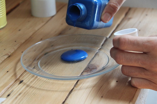 Pour some paint on a plate. You don’t need a lot of paint since you will be stenciling with a dry-brush technique. This means that your brush will have very little paint and that you will apply multiple layers.