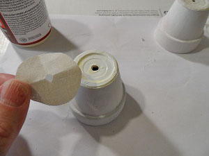 Trace bottom of clay pot on the ivory fabric. Cut out the circle and fold in half then in half again. Cut the tip off to create a hole in the middle of the circle. Decoupage this circle to the bottom of the pot.