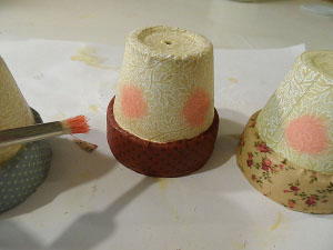 Decoupage patterned fabric onto the rim of the pot.