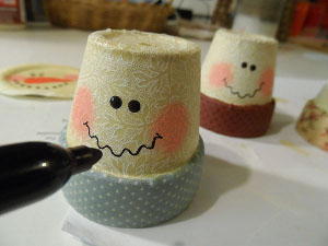 Use the handle end of the brush dipped in black paint to add eyes. Use a Sharpie to draw on mouths. Add nose with orange paint. Let the paint dry completely then add another layer of decoupage.