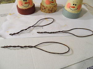 Make ornament hangers from rusty wire by bending a length of wire in half and creating a loop. Then twist the wire below the loop together.