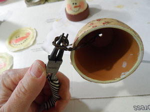 Insert the twisted end into the hole in the bottom of the pot. Squeeze the loop together so that you can push the loop almost all the way through the hole. This will give you enough room to coil the twisted end of the wire around your round nose pliers to keep the hanger from coming back through the hole.