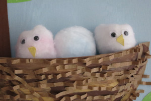 - To make the birds, rub your cotton balls with chalk. Add googly eyes and little paper beaks. Tuck the birds behind the nest.