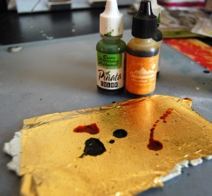 - Add a few drops of alcohol inks to the top of the foil. swirl around with a q-tip. Spritz with blending solution or rubbing alcohol.