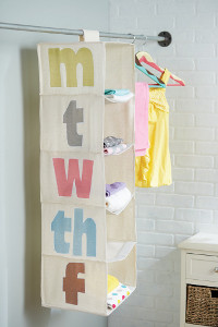 This clever organizer could also be used by boys to help them get dressed in the morning. Placing their socks, underwear, shirt and pants in the daily slots will help avoid last minute searches for something to wear. For girls you can add in tights and accessories. I think placing a laundry basket near the organizer can help teach children to get their clothing ready for the laundry.