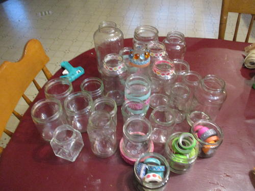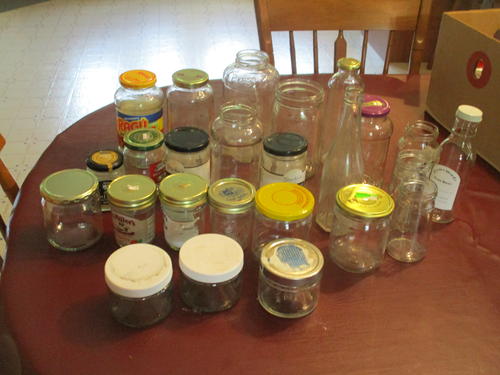 Gather a collection of old jars such as jars from spaghetti sauce, jelly, pickles, or whatever glass jars you have. Remove all the labels. Soaking them in warm water for a little while helps.