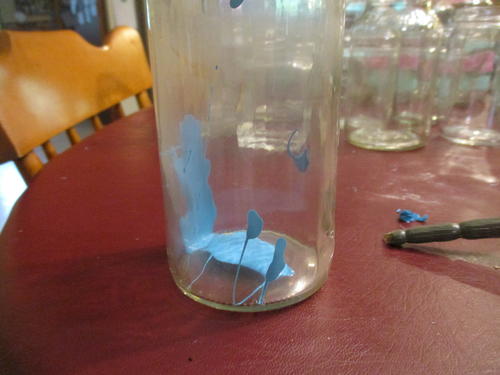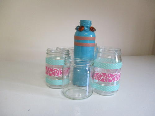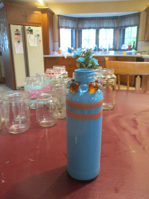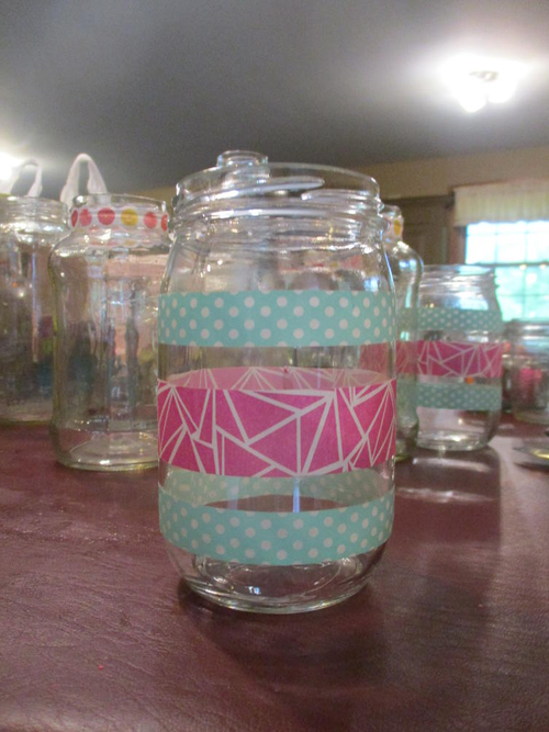 Now the work part is over and you can do the fun part. Decorate the jars by gluing pebbles on with the hot glue gun or wrap them in washi tape. For the blue jar in the middle, I squirted acrylic paint in the inside, popped the lid on, and shook it so it would spread around. The nice thing is that it's not wet on the outside but the down side is that it takes a LOT of paint and a while to dry. You could also spray paint some jars.
