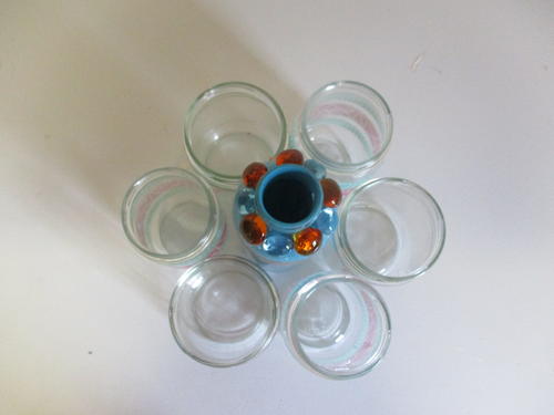 Now it's time to glue the jars on. Arrange all the jars on the circle again with the duct tape over the middle one. Use a hot glue to glue the middle jar on first. It is very important to make sure you glue it exactly in the middle so all the jars fit around it. Hold it tightly against the cardboard for a few seconds until the glue is pretty dry. Glue the outside jars on one at a time the same way until you are done. Now step back and look at your project. You're almost done!