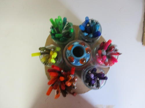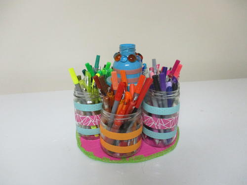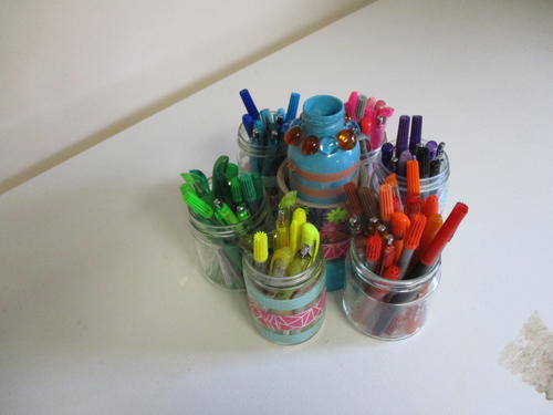 "I have been collecting old jars and bottles for a while now, but didn't quite know what to do with them. Once I was delighted to find a box of old jelly jars and other kinds of jars for free. Finally, I came up with this idea of how to use some jars as well as keep my pens, markers, and duct tape organized. Now they are also organized by color which should make it easier when I'm making cards or scrapbooking."
