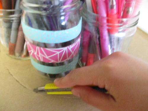Fill the jars with your pens and markers according to their colors. Slip the duct tape over the narrow jar in the middle as a way to organize that. For every other jar I used a wider one so I could fit more pens in it for colors that I have more of.