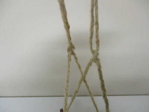 Lay the one braid over top of the other so they cross like it shows in the picture. Put the organizer on top with the spot where the braided twine crosses right in the middle. Bring the two ends of the one braid up over the middle vase and tie a knot. (Make sure to leave room for a flower.) Do the same with the two ends of the other braid. When you hold the two knots up it should look like the picture with four loose braids above the knot. Take two loose braids in one hand and the other two loose braids in the other hand and knot them together once or twice. Then tie the first half of a knot several times until you don't have much string left. Now you are finished with your pen organizer and you can either hang it up or set it somewhere handy.