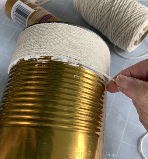 Smear on a generous amount of tacky glue just below the top edge and begin wrapping twine tightly around the can.