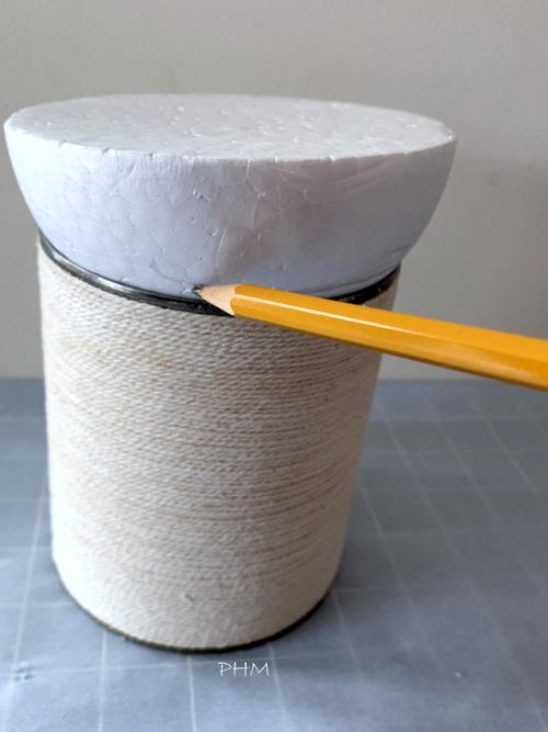 For the top: Measure across can opening and take a styrofoam ball (I had a half 4"ball) that fits just inside the top. Make sure it sits straight and level. Then draw a pencil line around ball where top of can meets.