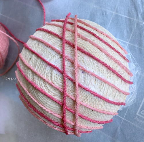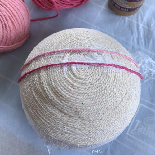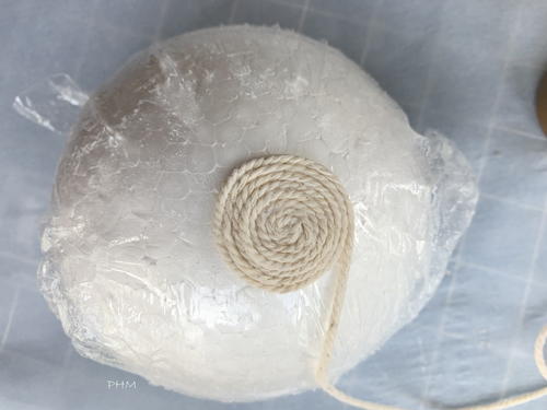 Wrap the ball in plastic wrap, securing it at bottom and then place a dollop of tacky glue on the center top. Place end of twine in glue and begin wrapping tightly around styrofoam.