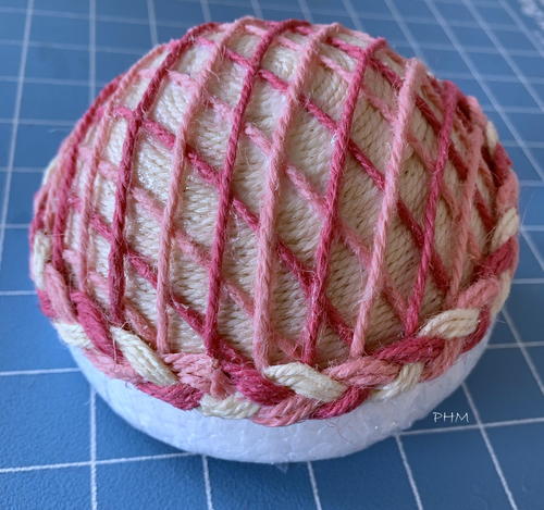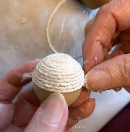 Wrap a wood ball with twine starting in the center the same way as the top and let dry. Glue wrapped ball in the middle of top with super glue.