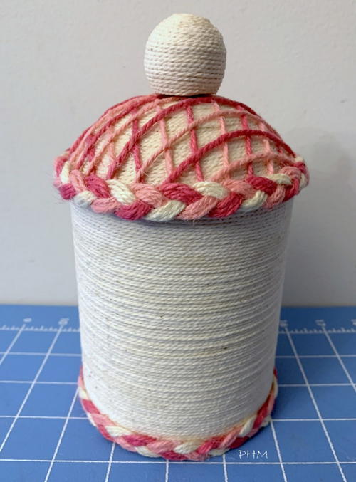 Once braided, saturate the twine with tacky glue where it starts and ends around the top base and can bottom so the braid won't unravel when cut. Let dry. Glue on the braid at the base of top and also on the base of the can. Then loosen the plastic wrap from the styrofoam and remove the top. Then cut off excess twine strings around the base.