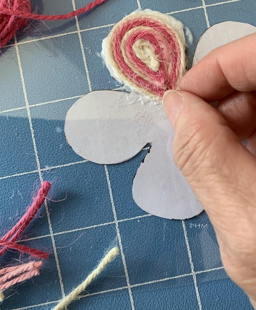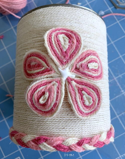 To add a decorative twine flower to the front of the can, take a simple flower paper pattern and place under a clear plastic sheet. Add a generous amount of glue around the petal shape (on plastic) and cut strips of twine to wrap around the petals in the glue. Alternate twine colors and glue together around the petal until filled in. Repeat for each petal and let dry.