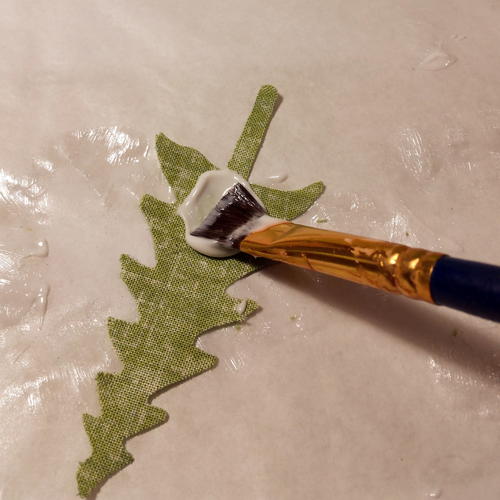 After die cutting the trees it was time to apply the Mod Podge. I grabbed a fluffy craft paint brush and applied the Mod Podge to the back of each piece one at a time. It dries surprisingly FAST! Apply the appliqué to your base piece and use your fingers to smooth the fabric piece down, starting from the center and working your way out to the edge to avoid trapping air bubbles underneath. Set everything aside to dry for a couple of hours. I had a couple of stray threads that had come loose from the edges and I used tiny scissors to trim them away before moving on to the next step.