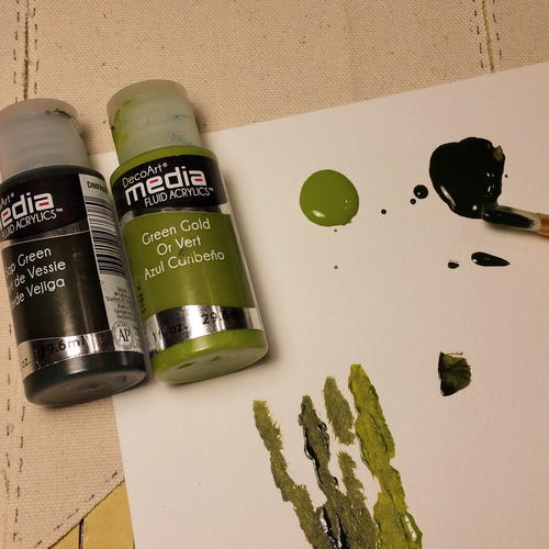 I started by adding faux stitching around the edges of each panel, then painting some trees in the style of Bob Ross for the background. Putting two shades of paint on my mixing palette and loading both on my brush at the same time gave me the depth of color I was looking for.