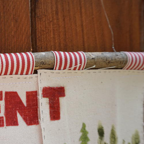 To hang the banner I sewed loops made from cotton ribbon (isn't that the cutest ribbon EVER?? It is a roll I have been hoarding saving for a while now as it is no longer available). I grabbed a stick from the back yard to hang it from and there you go- super cute banner all ready to add to our nurse's tent.