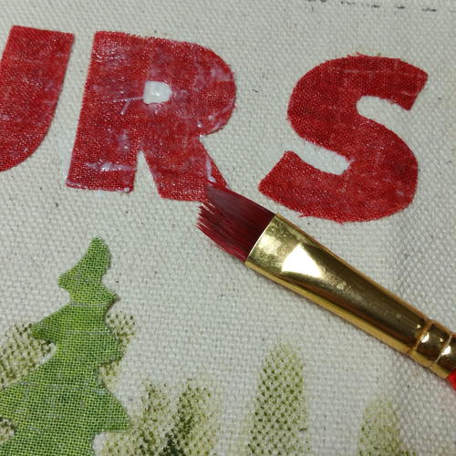 Apply a thin layer of Mod Podge to the top of the appliqués to seal. Using a fairly stiff paintbrush, I brushed just slightly over the edge to make sure I didn't leave any loose threads from the fabric. I also went ahead and brushed a thin layer over the painted areas since we will be using this banner outside.