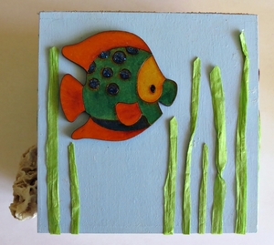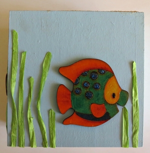 - Glue the big fish to the front panel. Add strips of green raffia to the cube to make “sea weed.”