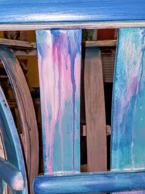 From the Designer: "I took an aged and water damaged end table and transformed it into a Bohomenian masterpiece using Plaid Folk Art Chalk Paint. I started with Vintage Victorian and added in some hot pink...mixed the Cascade and Nautical (blues) together and randomly painted areas on the table. I also used a squirt bottle to make drips and splats of paint. Mixing colors and a squirt bottle gave new life into a piece of furniture destined for the junk pile."