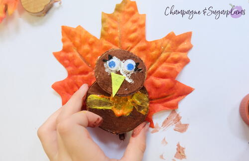 Firstly, paint the wooden rounds brown. Add some details using other colours like wings and feathers