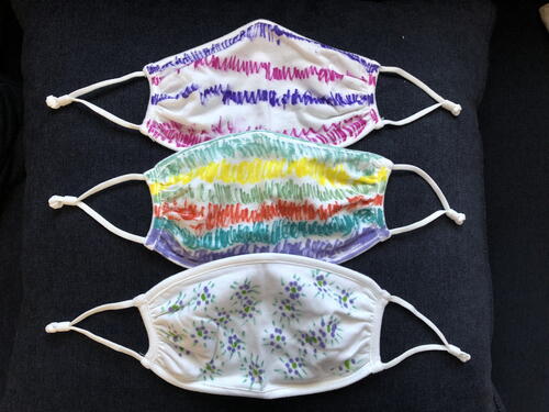 Draw your design on each of the masks with permanent markers. I used Sharpie brand markers, but you could use any brand. I decided to try a dot design, a rainbow of colors and just two complimentary colors. I literally just drew and colored on the masks as I would a piece of paper.
