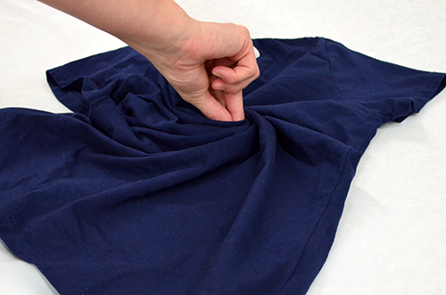 Pinch shirt front between thumb and forefinger, and twist until entire shirt is twisted into a spiral.