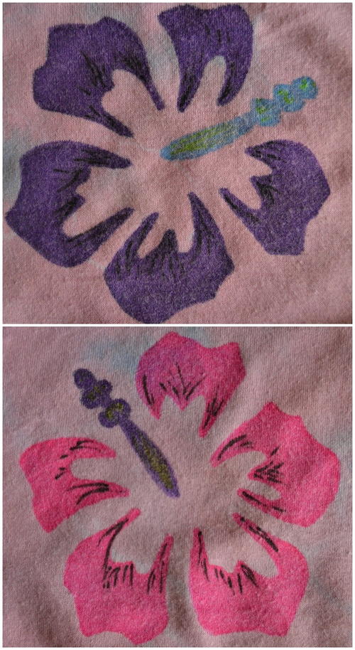 Use the violet and ultramarine blue fabric pens to add the stencil design of the first hibiscus flower to the shirt.