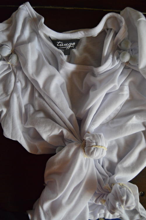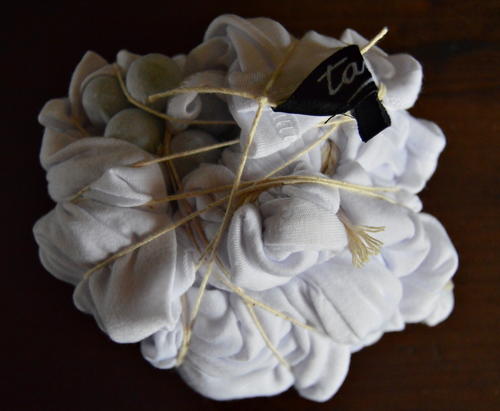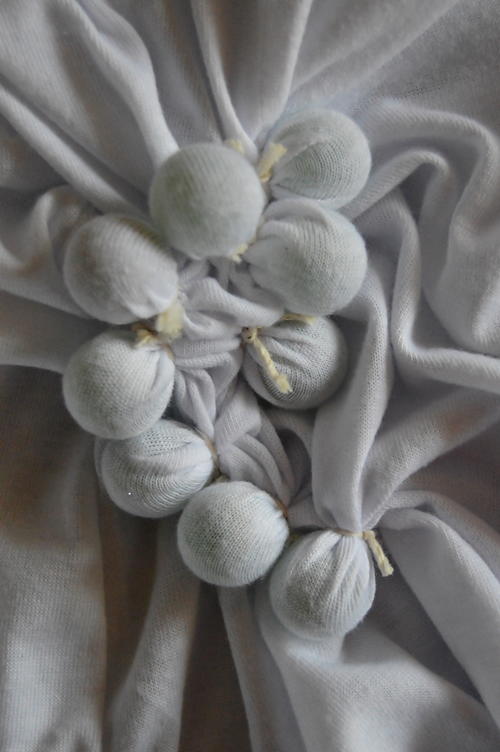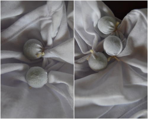 At the left shoulder area, put a marble between the front and back of the shirt. Wrap the front of the shirt around the marble and tie around the fabric with 1mm twine to keep the marble in place. Repeat with two more marbles.
