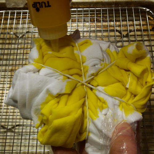 You will the first color to every other section and then fill in with the second color. I like to do this step on a cookie sheet with a rack. That way if I have to put the shirt down it is on the rack, rather than sitting in the dye. Be careful not to splash the die onto your clothing.