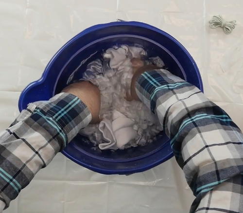 Take your fabric out of the bag and take the rubber bands off. Tip: use plastic gloves to avoid staining your hands with the food coloring. If you accidentally get tie dye on your hands, check out our article How to Remove Tie Dye from Skin.