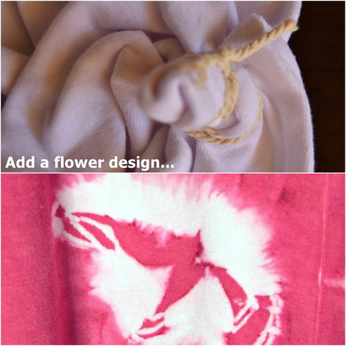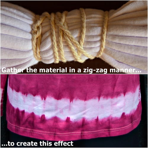 Gather the bottom of the shirt in a zig-zag manner and tie a string - also in a zig-zag manner - around the gathered material.