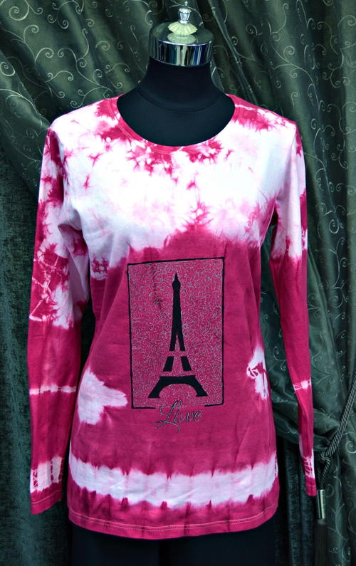 The striking pink dye used for this tie-dye project catches the eye and gives off that romantic feeling Paris is known for. Others are sure to notice you in this gorgeous bright shirt, and for good reason.