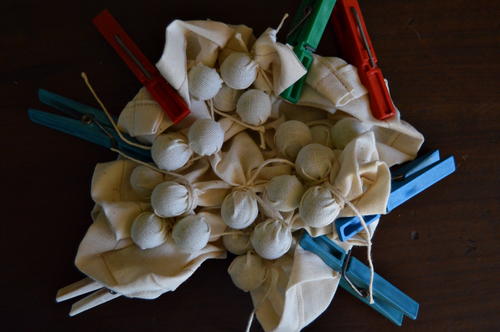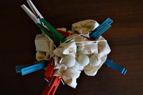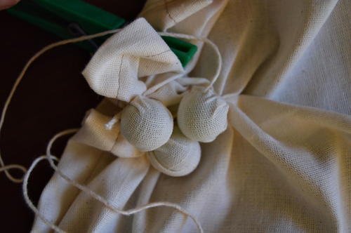 Put a marble under the piece of linen. Wrap the linen around the marble and tie around the linen with 1mm twine to keep the marble in place. Repeat with the other 19 marbles, adding the marbles at random places.