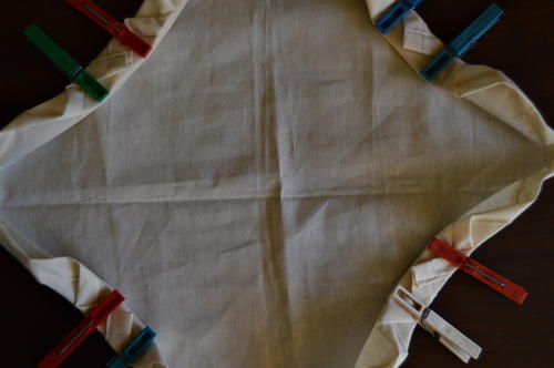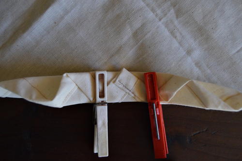 At the first corner, fold the material towards the centre in a zigzag manner ~ fold three 1” wide zigzags and use two clothing pegs to keep the zigzags in place.