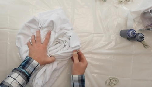 Create a tie dye pattern of your choice with your rubber bands. We created a swirl with our shirt and rubber bands.