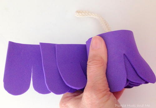 To make the scrubbie, place the strips of foam petals on top of each other, staggering the pieces so that the longer length end is on the outside, then the next length and the shortest on top.