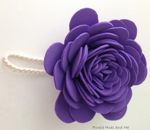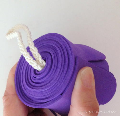 Begin rolling the foam sheets together starting with the smaller petals. Be sure to roll tight while keeping the edges straight. The strips are staggered near the end as you roll.