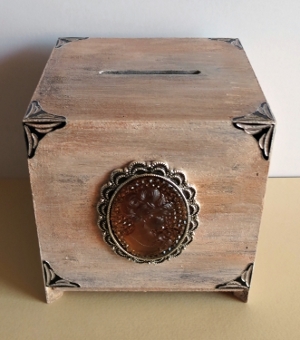 - Hot glue the resin cameo to the alloy base setting. Allow to dry and then hot glue the cameo to the front panel of the money box.